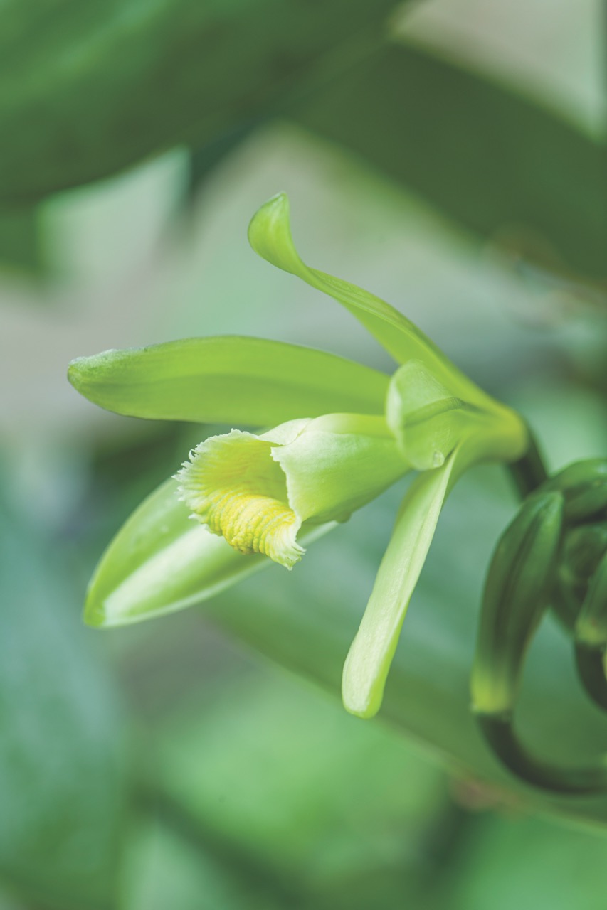 Several species are of particular note in our collection. Vanilla planifolia (vanilla) is a trailing orchid growing up to 15m in length and bearing fleshy aerial roots that help it cling to host trees. A native of Mexico and north and central South America, it grows in lowland tropical forests, but is now rare in its native range due to habitat destruction and over-exploitation. Today, vanilla is grown more extensively in South America, Java, New Guinea, Malaysia, the Seychelles and Madagascar, although the absence of its natural pollinator (the Melipona bee) means that this species must be pollinated by hand in order to produce vanilla pods.