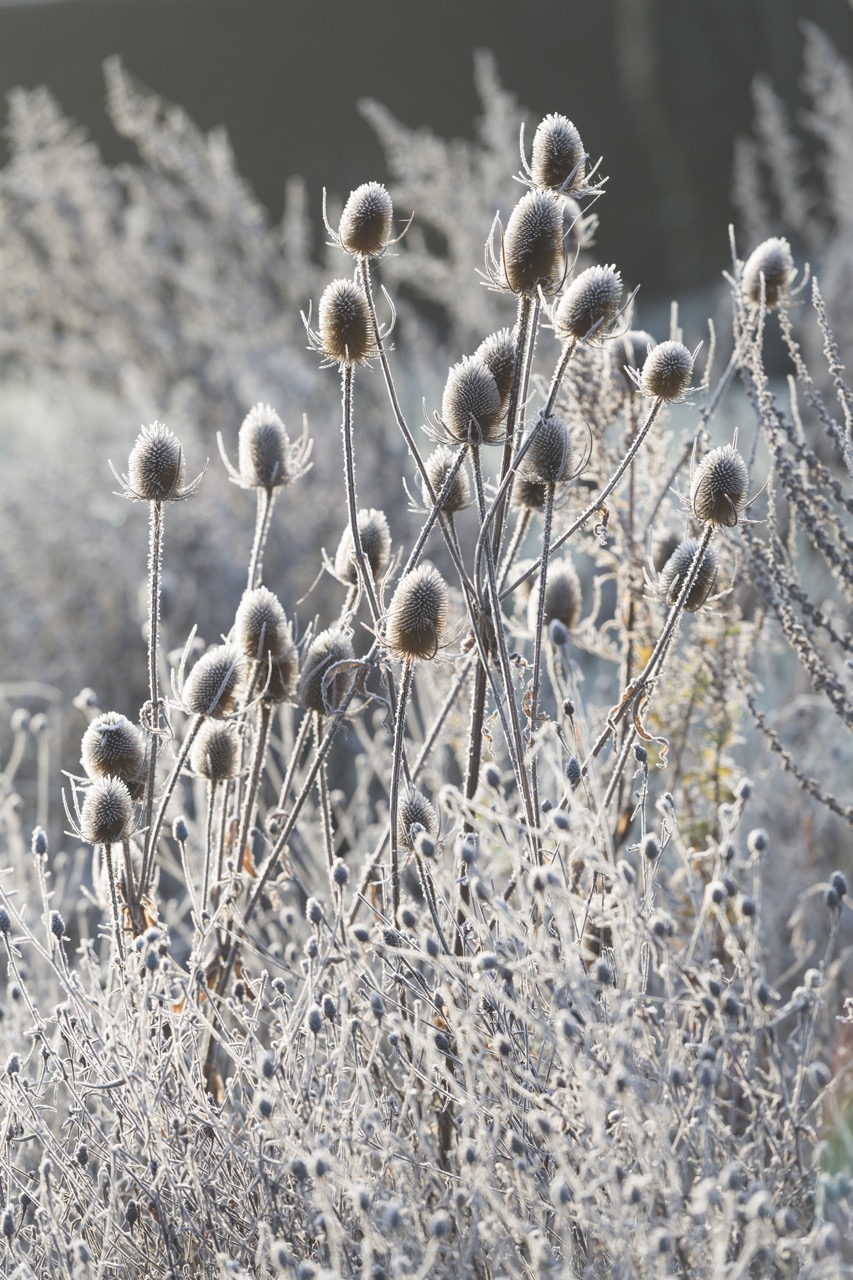 Leaving the seed heads of herbaceous perennials such as Turkish sage (Phlomis russeliana), teasel (Dipsacus fullonum) or ornamental grass through winter provides a habitat for overwintering insects such as wood lice, bees, ladybirds and lace wings, and the seed is a source of food for birds such as goldfinches. As an added benefit, you can enjoy the dramatic effect of hoar frost on these architectural seed heads.